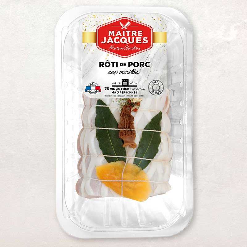 Parfait pour votre repas de fin d'année, ce rôti de porc festif aux morilles a été élaboré à partir d'ingrédients de qualité : filet de porc origine France, farce festive, morilles, mangue, barde, laurier, persil, poivron, oignon.