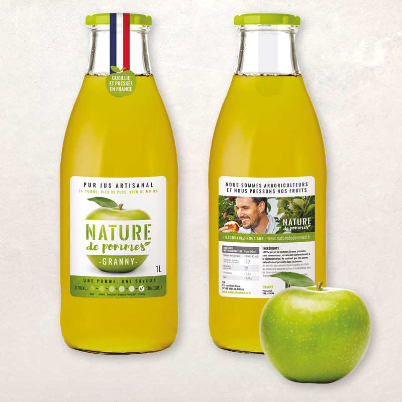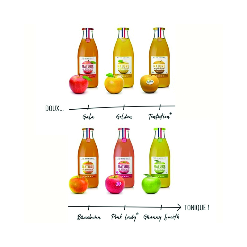 Jus monovariétaux de pommes pressées origine France : Ariane, Braeburn, Gala, Golden, Granny, Pink Lady®, Tentation®.