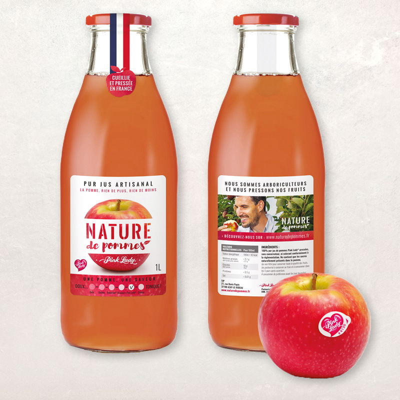Jus monovariétaux de pommes pressées origine France : Ariane, Braeburn, Gala, Golden, Granny, Pink Lady®, Tentation®.