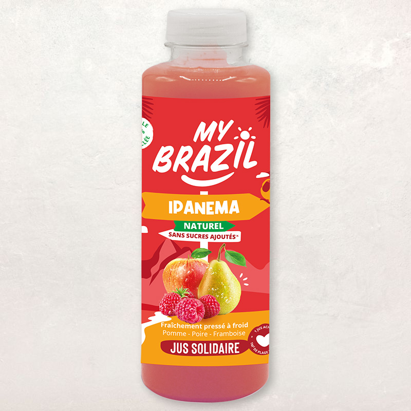 Ce jus Ipanema est composé 100% de fruits frais (Pomme (50%), Poire (35%), Fraise (13%), Framboise (2%)) issus de l’agriculture raisonnée du Brésil.