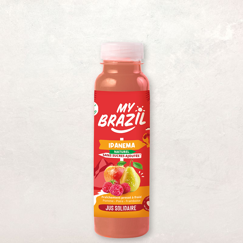 Ce jus Ipanema est composé 100% de fruits frais (Pomme (50%), Poire (35%), Fraise (13%), Framboise (2%)) issus de l’agriculture raisonnée du Brésil.