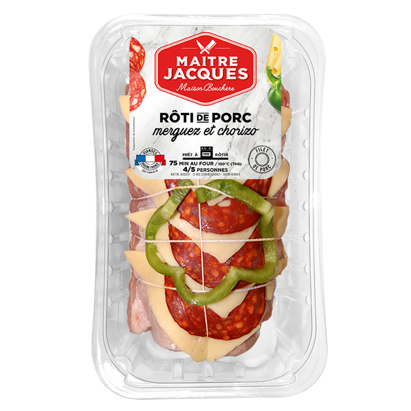 Préchauffer le four à 180°C. Dans une cocotte ou dans un plat allant au four, déposer le rôti de porc merguez chorizo et les gousses d’ail en chemise. Poivrer. Mettre un fond d’eau et passer au four pendant 1h. Bien arroser le rôti de porc pendant le temps de la cuisson. Et les 20 dernières minutes, couvrir le plat. Envelopper le rôti de porc merguez chorizo de papier sulfurisé pendant 15 minutes pour garder tout son moelleux avant le tranchage. Pour plus de gourmandise lors de la dégustation, ajouter de la crème fraîche.