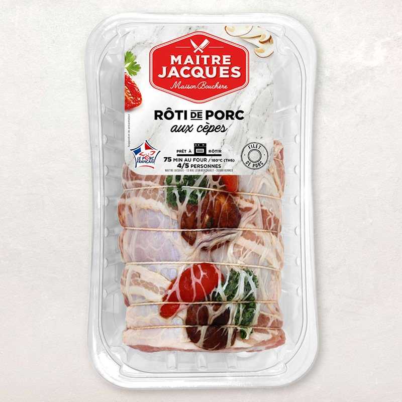 Prêt à cuire, ce rôti de porc aux cèpes a été élaboré à partir d'ingrédients de qualité : filet de porc origine France, chair, barde, poitrine fumée, cèpes, tomate marinée, persil.