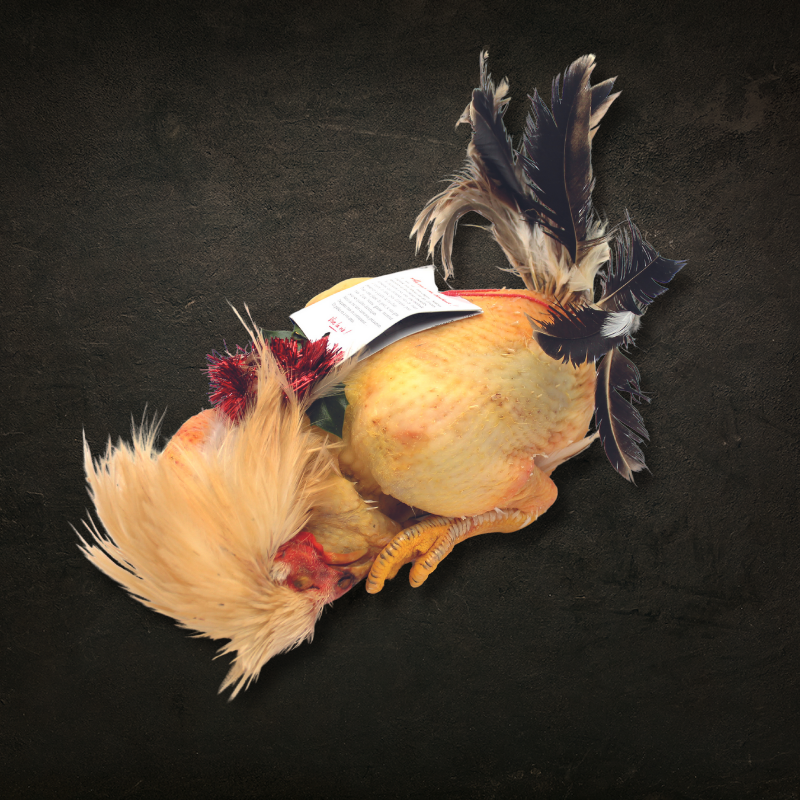 C’est un coq de souche naine né en juin et engraissé jusqu’en décembre.