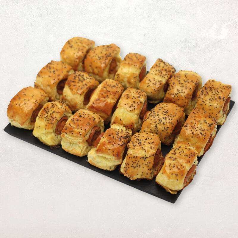 Pâte feuilletée 52,6 % (farine de BLÉ, BEURRE, eau, sel, jus de citron, curcuma), saucisse 40,4% [viande de porc (origine : UE) 29%,\neau, oignons, gras de porc, sel, conservateurs (lactate de potassium, acétate de sodium, nitrite de sodium), plasma de porc, dextrose, sirop de glucose, épices, arômes naturels, antioxydant : érythorbate de sodium, colorants (extrait de paprika, carmins), arôme de fumée], blanc d'OEUF en poudre, GLUTEN de BLÉ, OEUFS entiers, graines de pavot 0,3%.