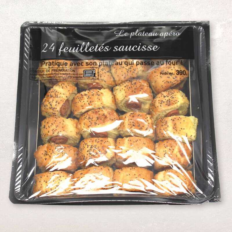 Très pratiques avec leur plateau qui passe au four ces saucisses feuilletées pur beurre sont parfaites pour un apéritif express et néanmoins très savoureux. Retirer l'emballage plastique puis réchauffer directement avec le plateau au four traditionnel 12mn à 210°C. Produit décongelé ne pas recongeler.