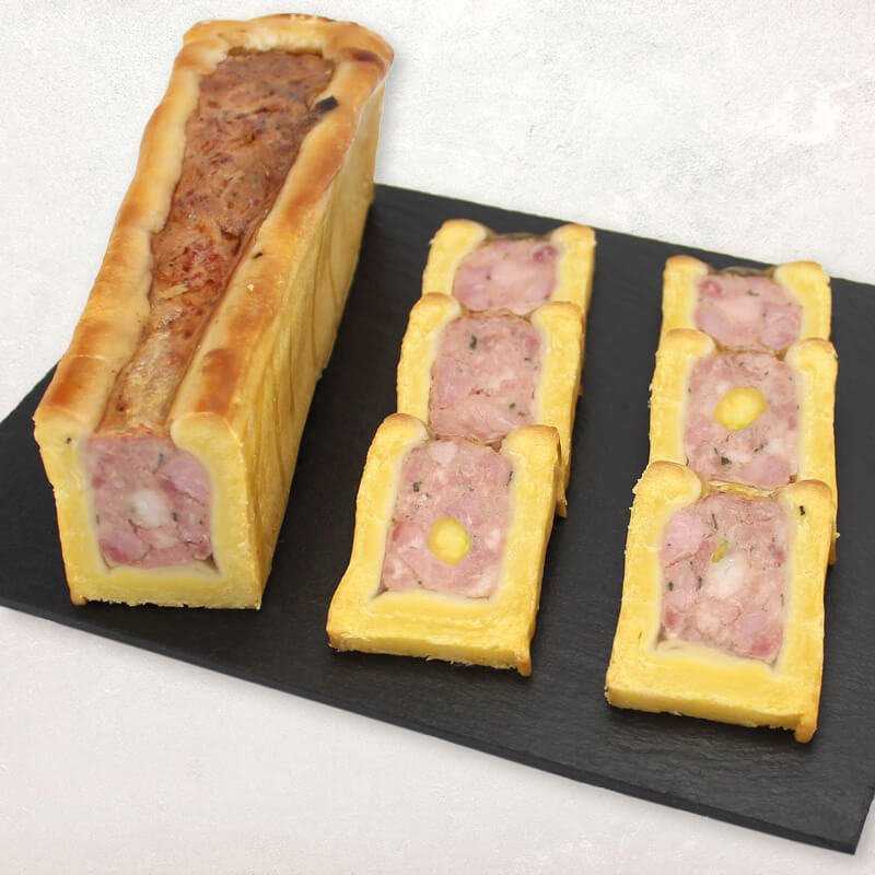 Ce mini pâté en croûte "Le Bistronome" jambon pistache est élaboré à partie de viandes de porc français marinées au vin blanc et agrémentées de pistaches.