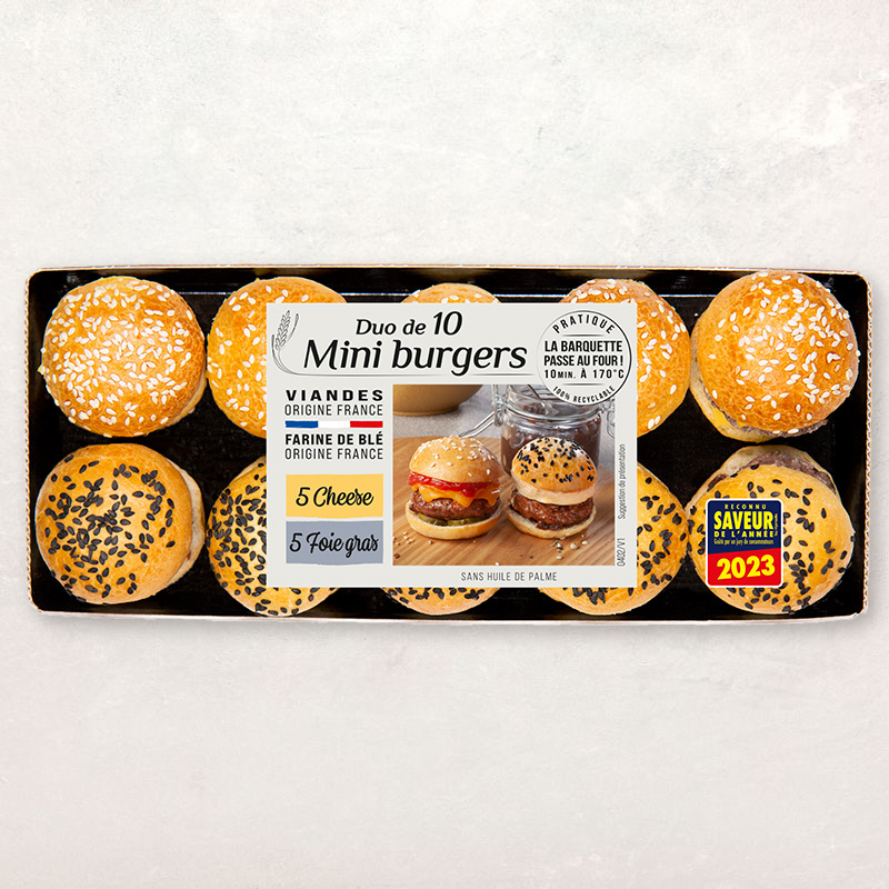 Le produit est composé de mini-pains à burger moelleux et légèrement toastés, garnis de généreux morceaux de steak haché de qualité supérieure et de foie gras de canard fondant.