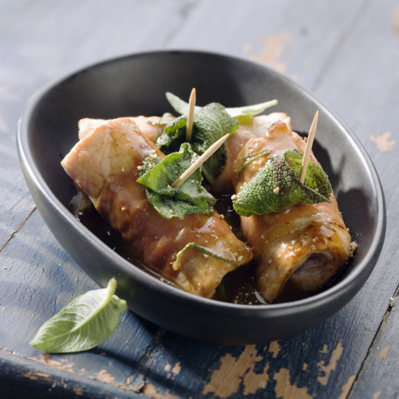Coupez-les en deux, recouvrez-les d'une demi-tranche de jambon italien et enroulez-les sur elles-mêmes autour d'une feuille de sauge. Ajoutez une feuille de sauge à l'extérieur de chaque rouleau et fixez le tout avec une petite pique en bois.