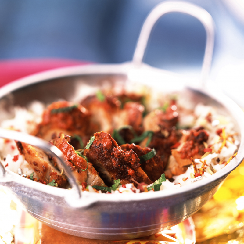 Disposez le riz cuit dans un plat chaud, ajoutez la viande coupée en tranches épaisses, parsemez de coriandre finement ciselée et servez de suite.