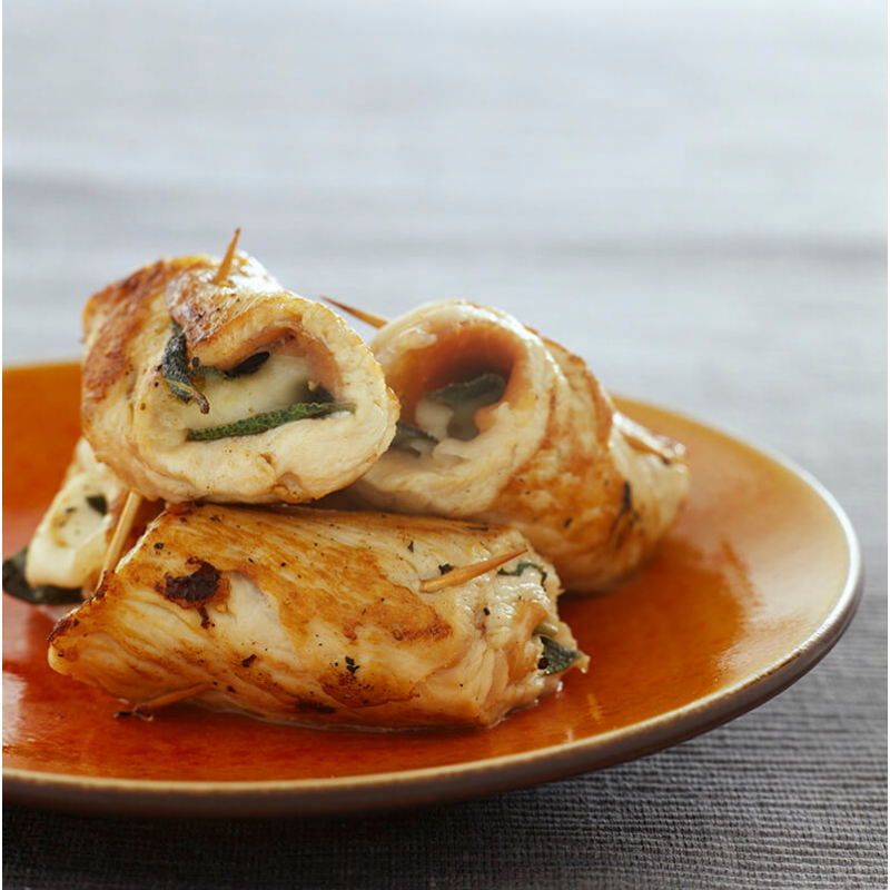 Coupez chaque escalope en 2 dans le sens de la longueur. Posez une demi-tranche de jambon italien sur chaque moitié d'escalope puis ajoutez un morceau de mozzarella et une feuille de sauge.