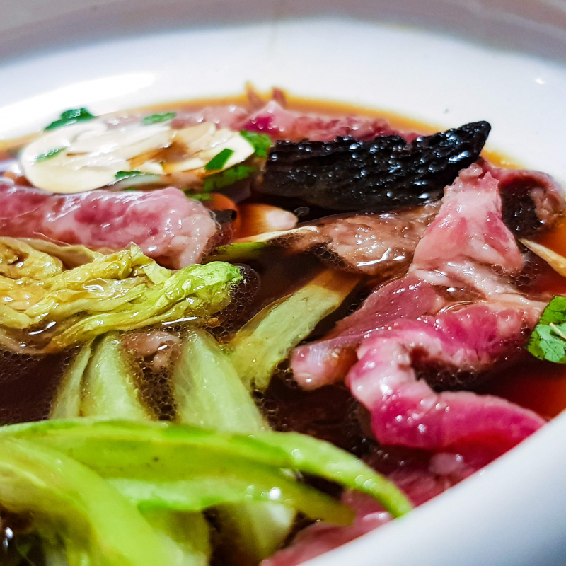 Inspiration de cette recette de boeuf wagyu en bouillon dashi aux morilles et légumes croquants