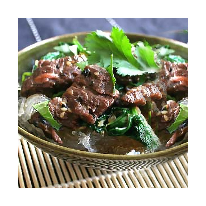 Présentation du boeuf mariné aux épinards : versez les vermicelles dans les bols, déposez le bœuf aux épinards dessus, parsemez de coriandre fraîche et de graines de sésame et servez bien chaud !