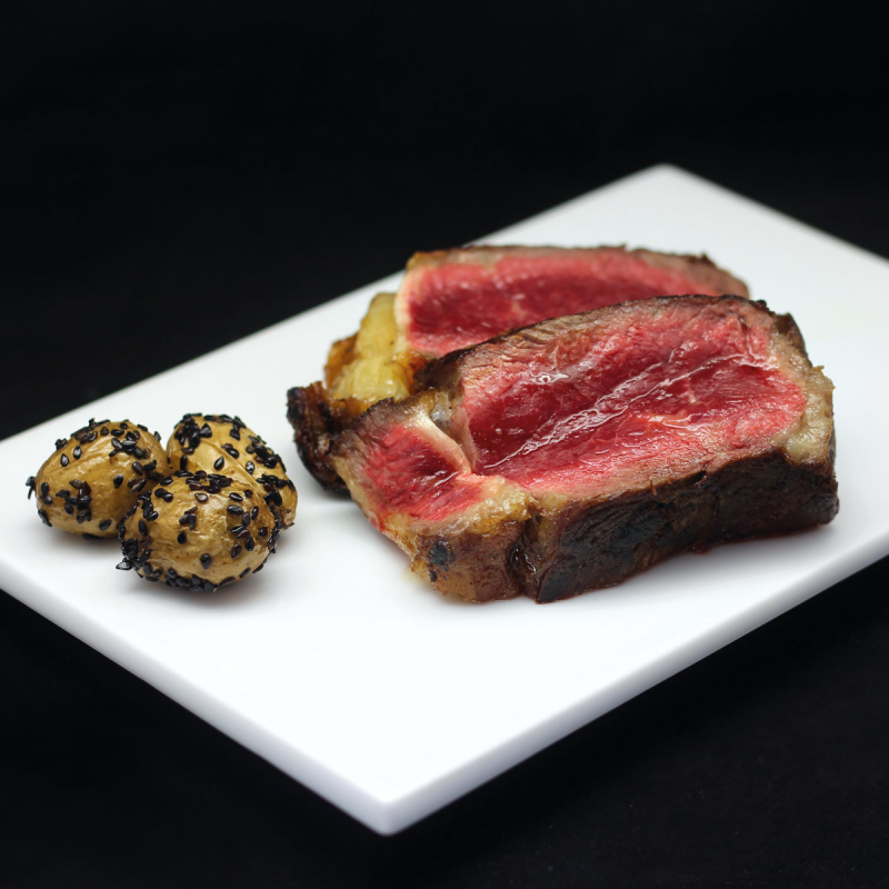 Découpez la côte et dressez sur une assiette chaude. Disposez autour les pommes de terre que vous avez roulé au préalable dans le sésame noir. Une pointe de citron sur le bord de l’assiette et servez aussitôt.