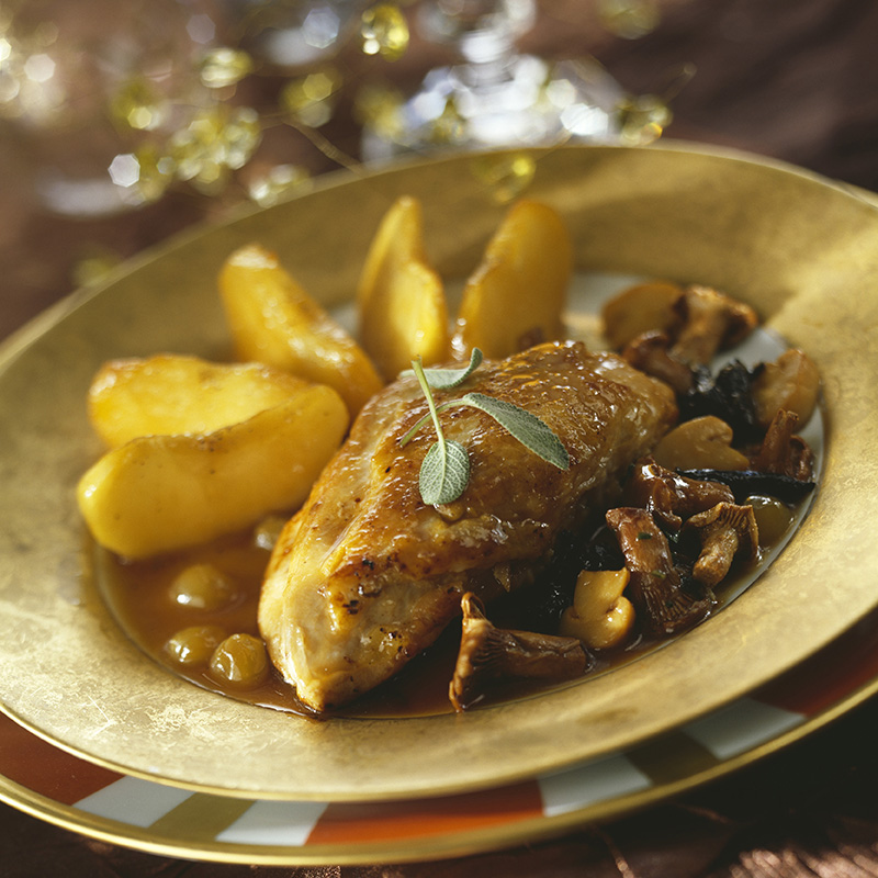 Présentez les blancs ou escalopes, coupés en épaisses tranches en diagonale dans des assiettes chaudes. Ajoutez les pommes et les champignons autour, nappez de sauce chaude et servez.