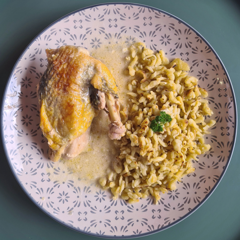 Typiquement alsacienne, cette recette associe la finesse de la sauce au Riesling à la saveur de volaille bien marquée de la pintade. La douceur et la texture fondante des spätzles maison sautés les accompagnent parfaitement.
