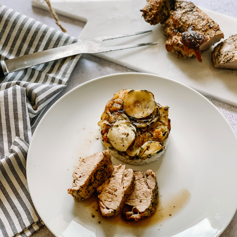 Il ne vous reste plus qu’à trancher votre filet mignon. Vous pouvez le présenter sur une assiette blanche accompagné des courgettes, le tout avec le jus de cuisson et quelques oignons.