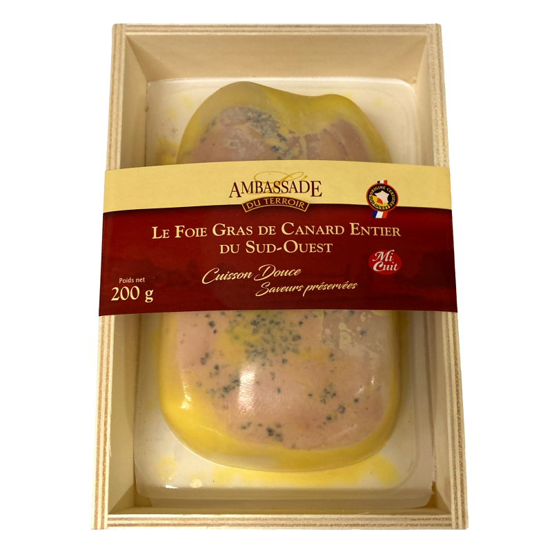 Ce savoureux foie gras de canard entier mi-cuit IGP Sud-Ouest a été soigneusement éveiné assaisonné simplement de sel et poivre comme traditionnellement dans la région.