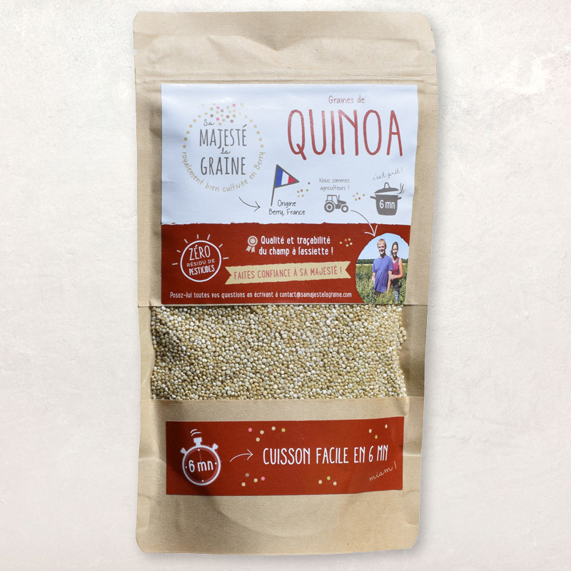 Quinoa 100% français cultivé dans le Berry ! Cet aliment riche en protéines et fibres se cuisine en accompagnement comme des pâtes ou du riz mais peut aussi servir de base à des salades et même à des desserts. Côté pratique il se cuit en 6 minutes seulement.