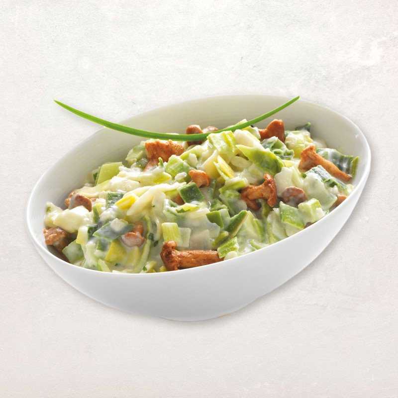 Poireaux émincés et girolles entières sués dans une tombée d'échalotes et beurre. Le tout est cuisiné dans une sauce crémée à base de fond de volaille et agrémenté de cerfeuil.