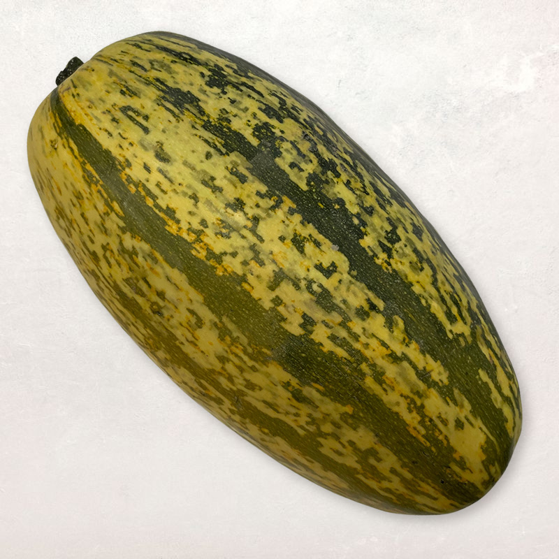 Elle fait partie des courges coureuses, sa peau est orange ou jaune et sa forme allongée.