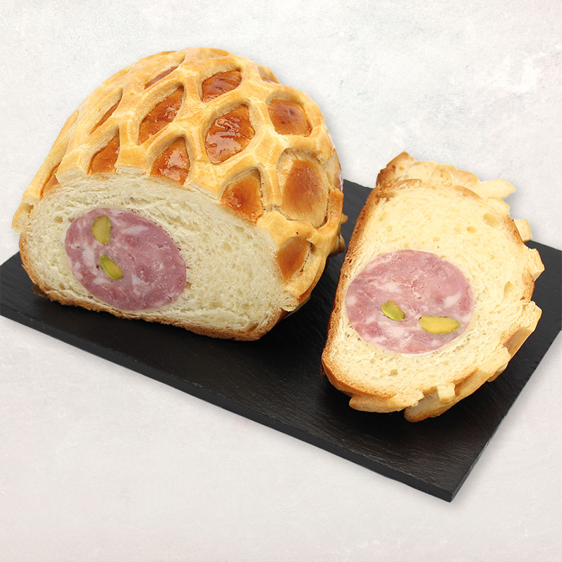 Ces saucisses briochées allient une pâte à brioche pur beurre moelleuse et une saucisse à cuite pur porc supérieur pistachée. Les ingrédients utilisés sont rigoureusement sélectionnés et le contrôle qualité est systématique. À servir chaude, en tranches avec une salade verte, la saucisse briochée à la pistache est une recette traditionnelle lyonnaise authentique et généreuse.