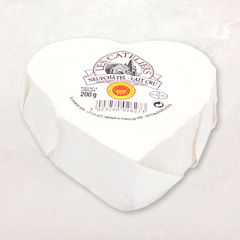 Avec sa forme caractéristique, ce Neufchâtel fait partie de la famille des fromages à croûte fleurie et à pâte molle. Sa croûte fleurie légèrement duveteuse donne un nez de sous bois.