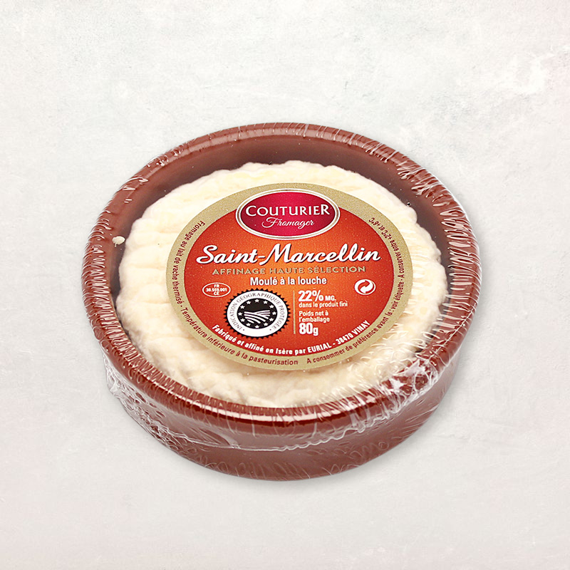 Le Saint-Marcellin un fromage à pâte molle offre une croûte fleurie vermiculée de couleur beige lui conférant un aspect traditionnel.