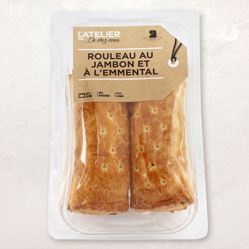 Le rouleau au jambon se compose d’une tranche de jambon et d’une tranche de fromage, roulées l’une dans l’autre, et entourées d’un manteau de pâte feuilletée.