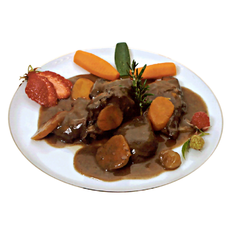 Marinée au vin rouge et mijotée dans une sauce à base de fond de boeuf, elle est relevée aux épices et adoucie par une gelée de groseille.
