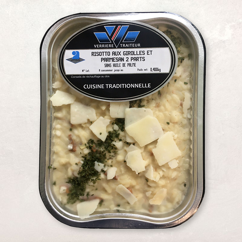 Ce savoureux risotto aux girolles et au parmesan est préparé avec du riz arborio de qualité supérieure, lentement cuit dans un bouillon de légumes pour lui donner une texture crémeuse et savoureuse.