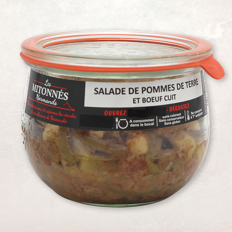 Savoureuse, cette salade de pommes de terre et boeuf cuit est préparée suivant une recette traditionnelle composée de viande bovine de race Normande et des légumes frais provenant principalement de Normandie (hors périodes de rupture saisonnière).