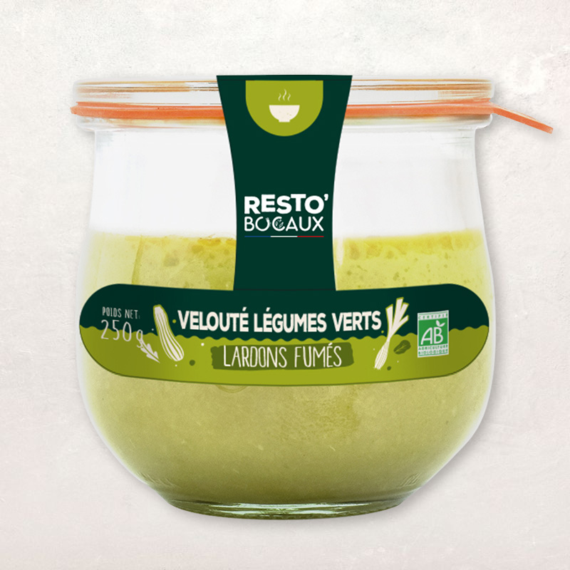 Ce velouté de légumes verts aux petits lardons fumés 250 g se savoure en famille ou entre amis.