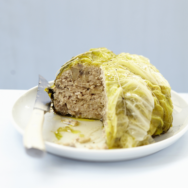 Séparez la farce obtenue en 8 boules et emballez les 8 boules dans 2 feuilles de chou chacune. Ficelez chaque boule emballée.