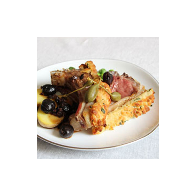 Coupez le feu du jus. Découpez le carré en faisant attention de ne pas détruire la croûte. Versez le jus d’olive dessus et servez avec des petits pois frais et des pommes de terre cuites avec la peau.