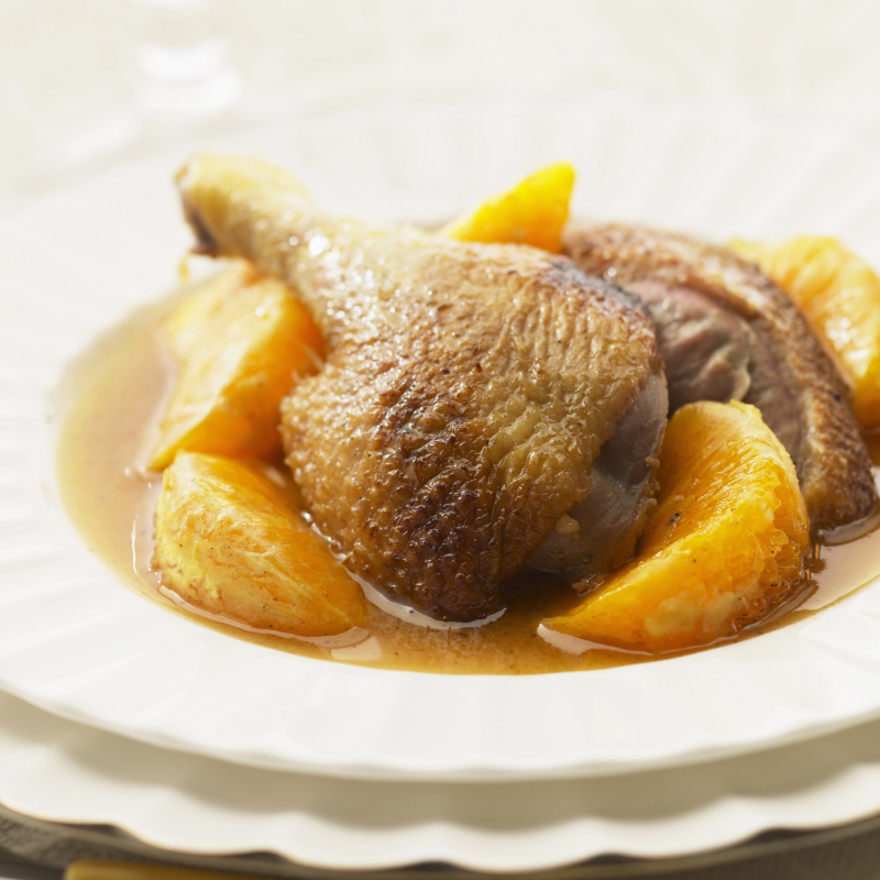 Servez les cuisses de canard entourées des quartiers d'orange en nappant avec la sauce ainsi obtenue.