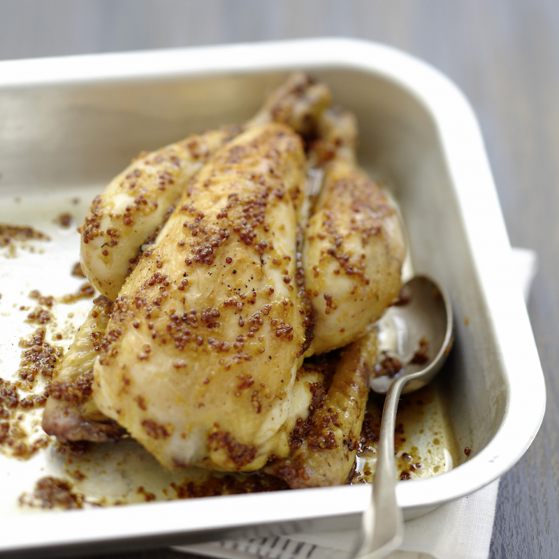 Après les 20 minutes de cuisson, badigeonnez les coquelets avec le mélange de moutarde, miel et vinaigre et enfournez à nouveau pour 25 minutes en versant un peu d’eau dans le fond du plat.