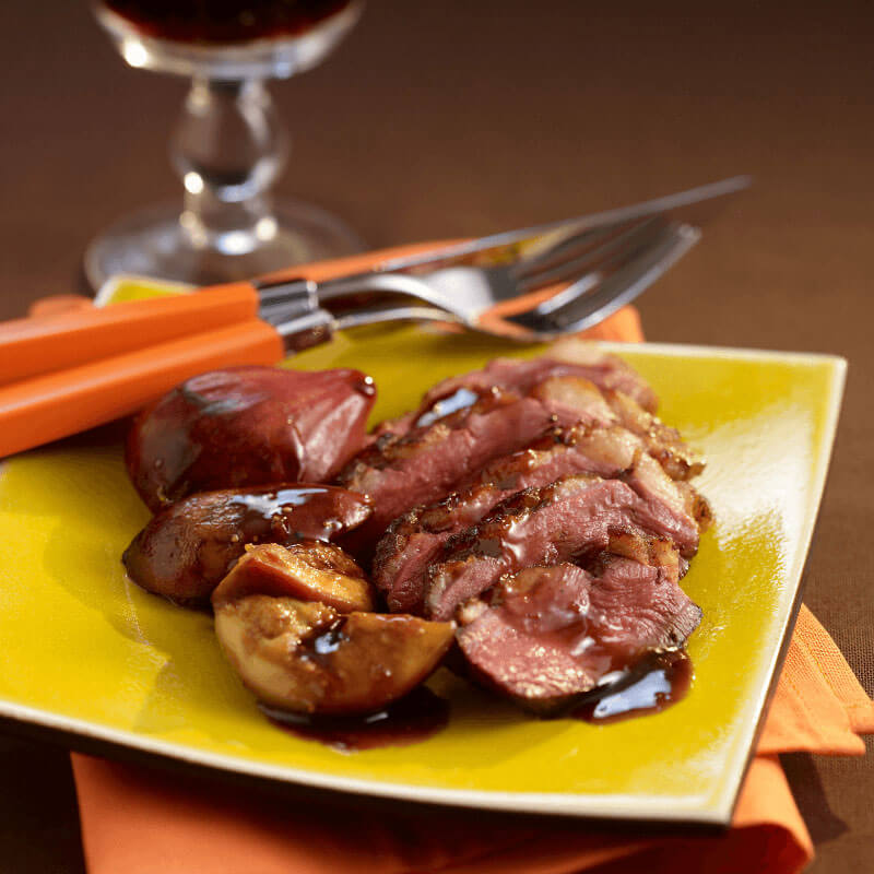 Dans cette recette, on appréciera la cuisson des magrets sur leur peau pour faire fondre leur graisse. En agrémentant de fruits de saison (figues et pommes), on profite pleinement du plaisir sucré-salé qui se marie si bien au canard.