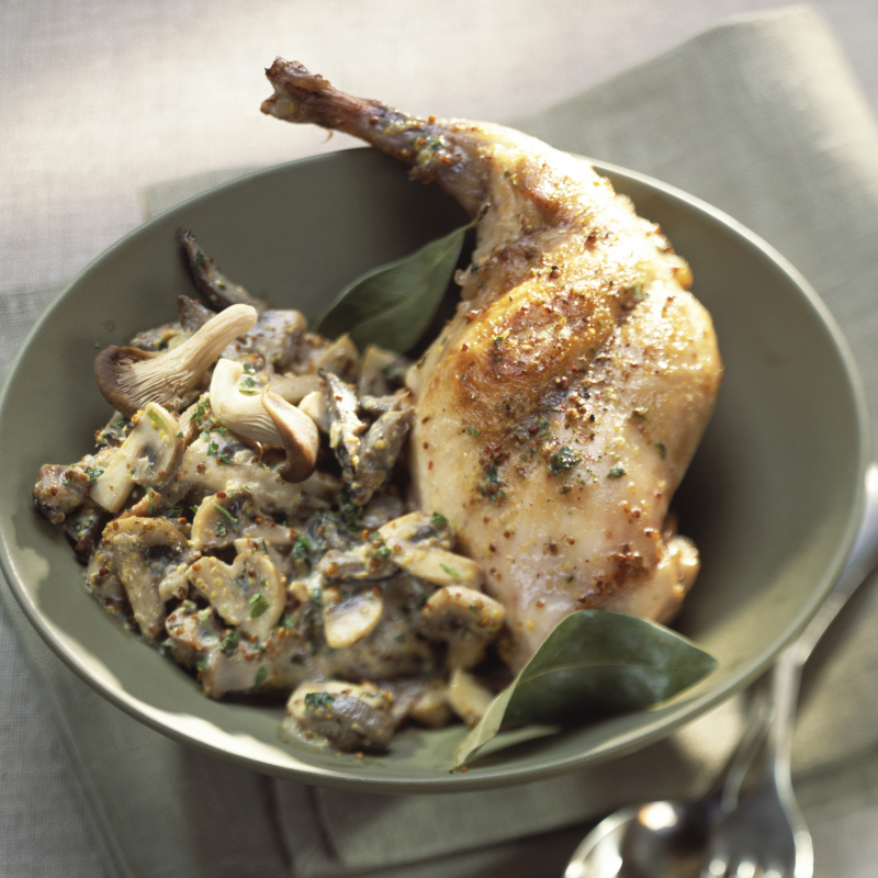 Mélangez les deux moutardes dans un bol avec la crème puis versez ce mélange dans la cocotte. Ajoutez les champignons, mélangez légèrement et laissez mijoter 20 minutes encore, sans couvrir et à feu doux.