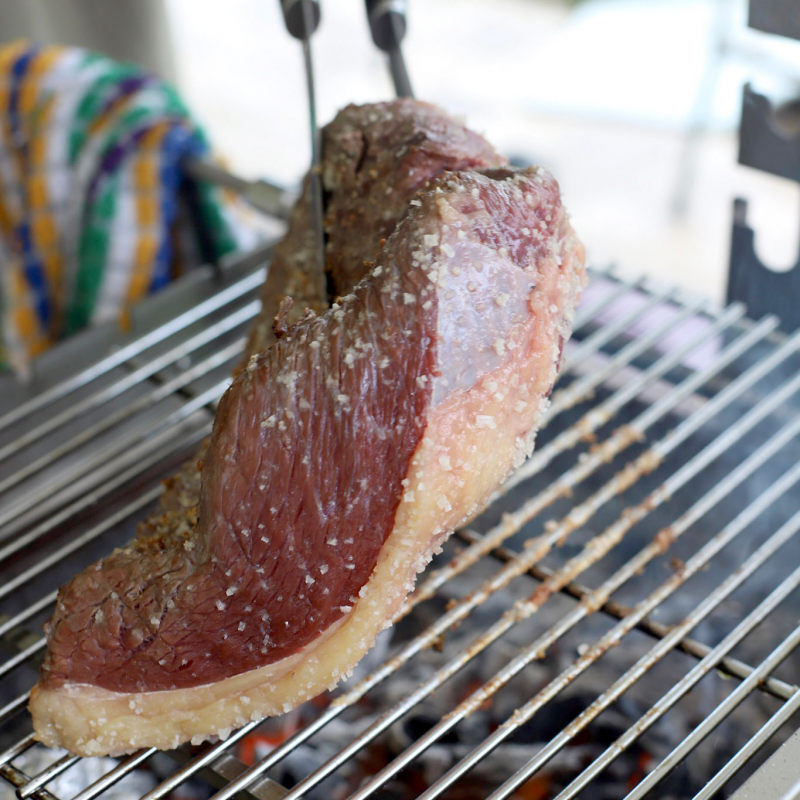 La picanha (appelée point de rumsteak) est une découpe brésilienne de viande particulièrement adaptée aux barbecues car la couche de graisse (comme un gros magret), pénètre les chairs et rend la viande ultra juteuse.