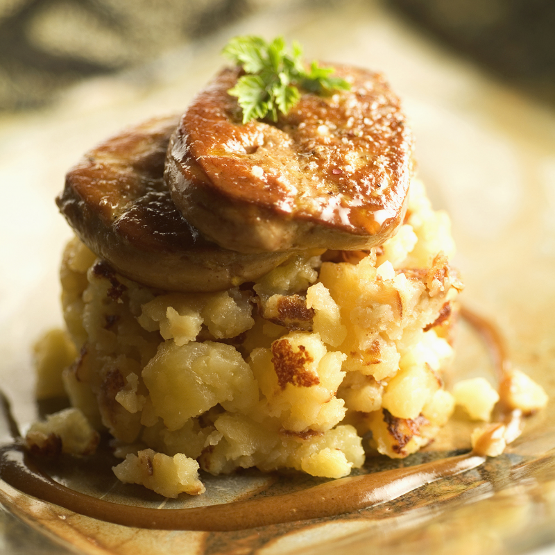 En accompagnement du foie gras poêlé, faites fondre les extrémités de foie gras cru prélevées dans une poêle chaude sans matière grasse et faites rissoler les pommes de terre 5 minutes à feu vif. Réduisez alors à feu doux, salez, poivrez et poursuivez la cuisson 30 minutes en remuant régulièrement.