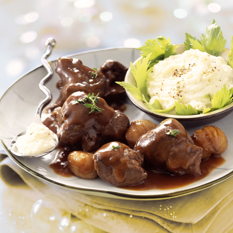 Faites chauffer les marrons à la vapeur. Servez la viande et les marrons nappés de sauce onctueuse avec la purée de céleri bien chaude et quelques tranches de pain.