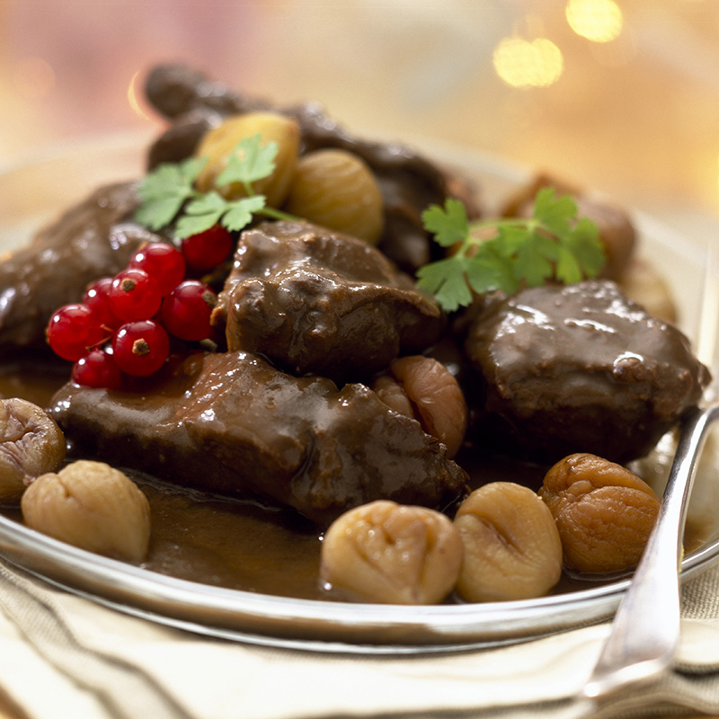 En fin de cuisson de la viande, lorsqu'elle est bien tendre, mettez-la dans un plat chaud et couvert. Passez la sauce au chinois et faites-la réduire si elle vous semble encore trop liquide, rectifiez l'assaisonnement puis liez-la à feu très doux avec la gelée de groseilles. Faites mousser le beurre dans une sauteuse, ajoutez les châtaignes et faites-les rissoler quelques minutes avant de les servir avec la viande nappée de sauce onctueuse. Ajoutez une grappe de groseilles pour la décoration.