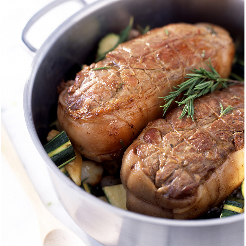 À mi-cuisson, ajoutez les courgettes et les pommes grenaille épluchées et coupées en deux, autour du rôti.