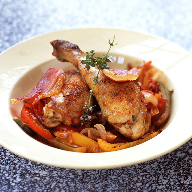 Saupoudrez la farine sur les pièces de poulet. ajoutez morceaux de tomates, les champignons, les lanières de poivron, le piment et le vin blanc. Assaisonnez et laissez cuire dans la cocotte couverte pendant 40 minutes.