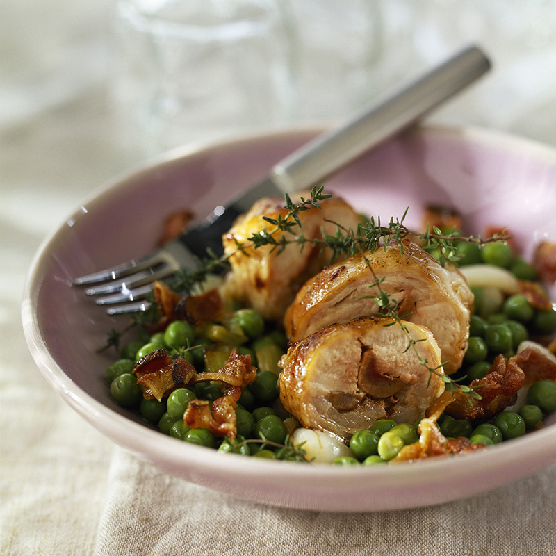 Rectifiez l'assaisonnement en fin de cuisson et servez les râbles coupés en tronçons avec les petits pois.