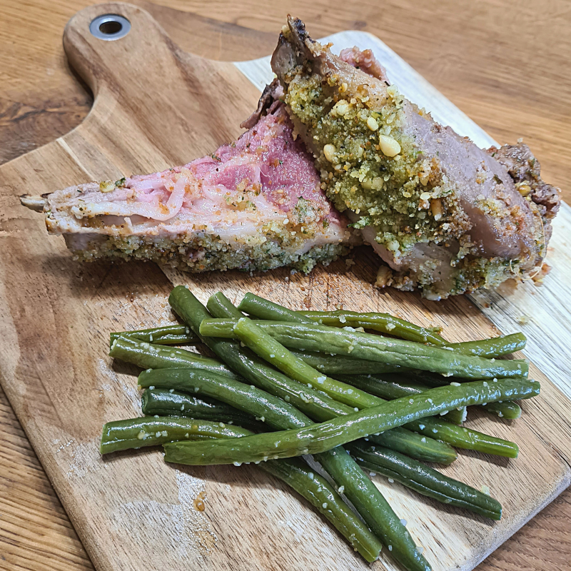 Vous pouvez servir ce carré d'agneau en croûte avec des haricots vapeur ou sautés en persillade, des haricots plats...Bien accompagner votre carré d'agneau en croûte d'herbes