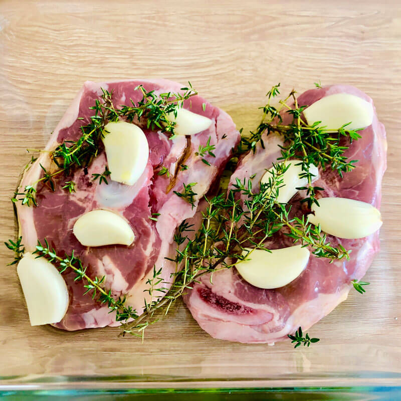 Déposer les côtes de filet d’agneau dans un plat. Arroser d’un filet d’huile d’olive, parsemer de thym et disposer les demi gousses d'ail sur l'agneau.