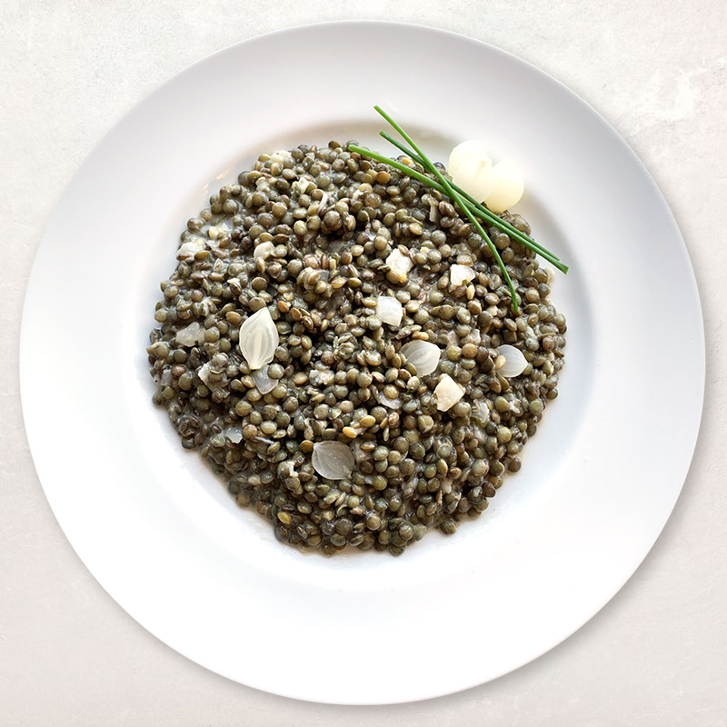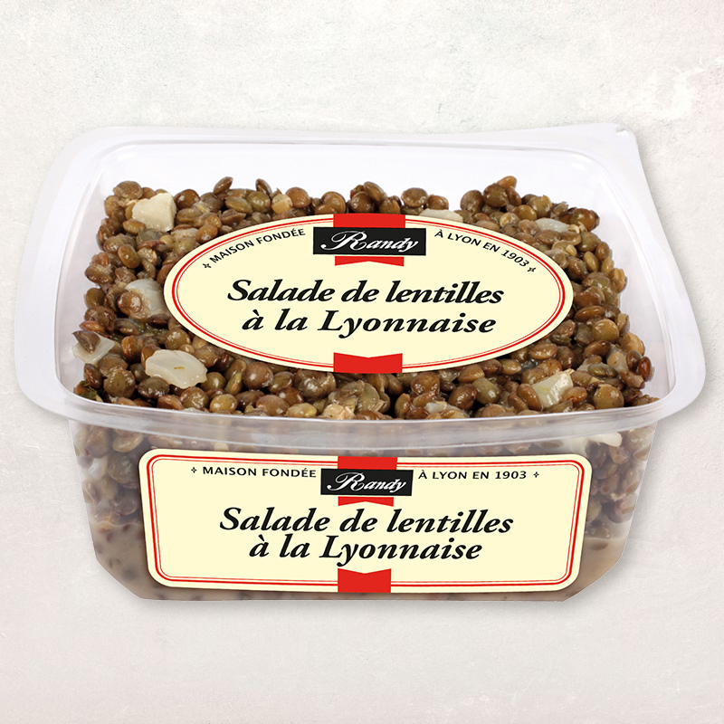 Lentilles cuites 73% (eau, lentilles, sel), eau, oignons, huile de colza, vinaigre d'alcool, jus de citron à base de concentré, épices, moutarde (eau, graines de MOUTARDE, vinaigre d'alcool, sel), sel, sucre, amidon transformé, épaississant : gomme xanthane. Présence possible de céréales contenant du gluten.