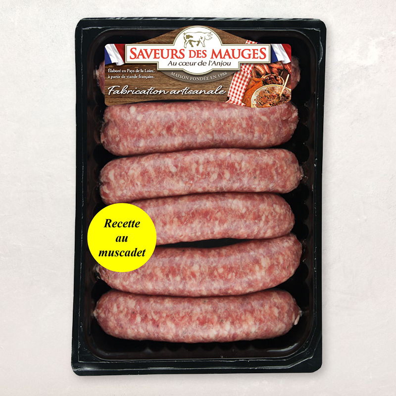 Ces saucisses sont élaborées à partir de viande de porc fraîche de qualité supérieure, assaisonnées d'un mélange subtil d'épices et de muscadet, un vin blanc typique de la région du Sud-Ouest de la France.